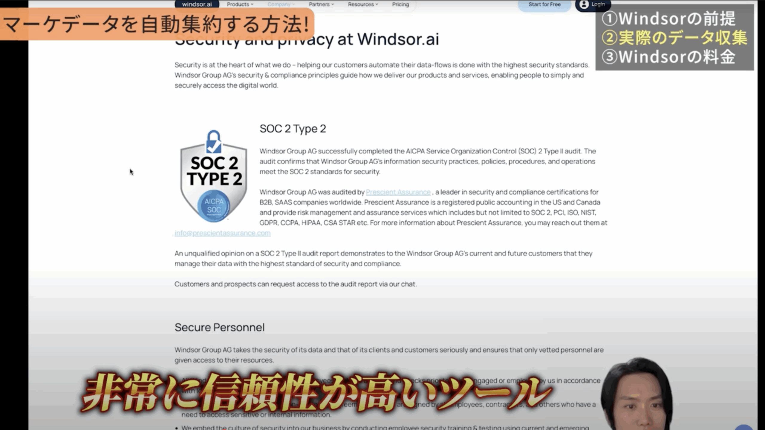 加えて、日本にはまだ馴染みが薄いかもしれませんが、SOC 2 Type 2という独立した第三者機関によるセキュリティ審査も受けています。このことは、一部の日本のETLツールと比較しても遜色ない、むしろそれ以上の信頼性をWindsor.aiが持っている証だと私は捉えています。